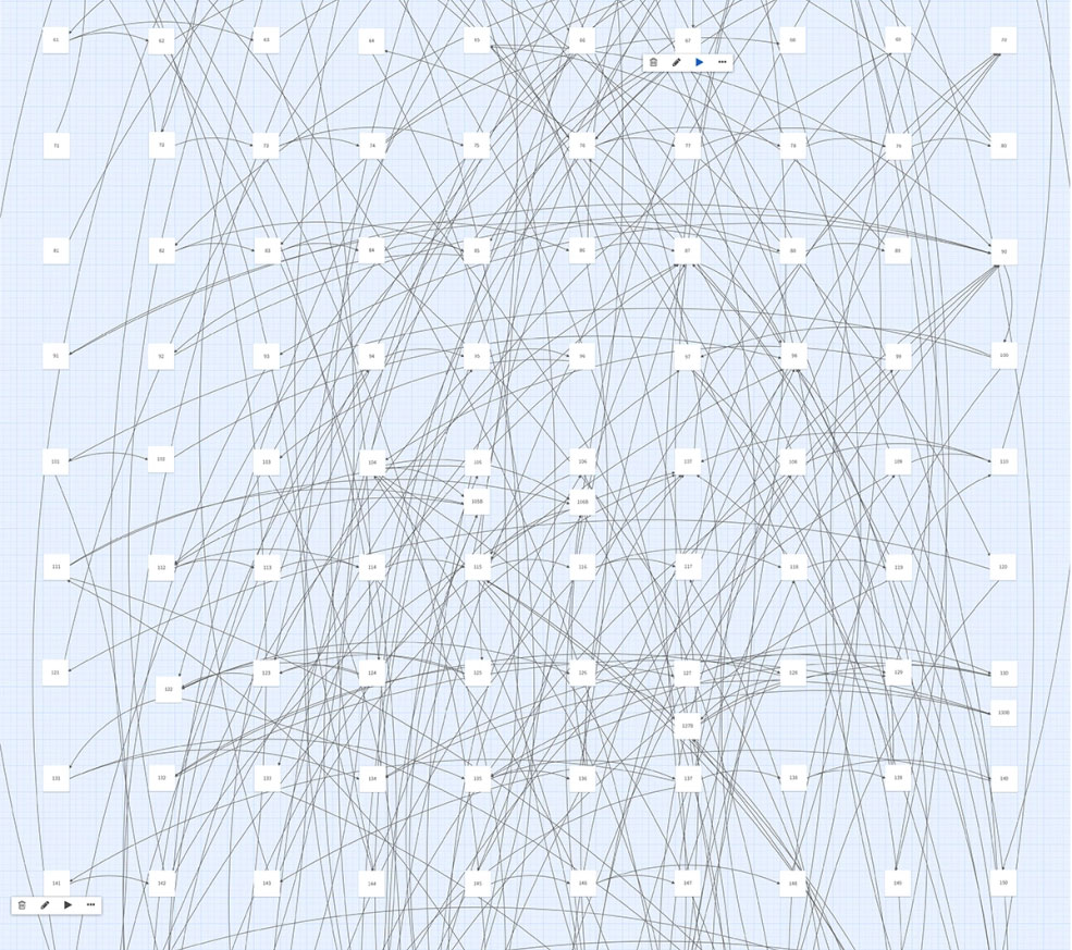 Mi intención era seguir con ese método hasta el final, pero en el acto 3 el árbol de posibilidades se hacía tan intrincado que me resultaba imposible seguir esquematizando en hojas de papel y tuve que ceder ante las virtudes de lo digital. Me decidí a usar el infinito lienzo virtual que ofrece la aplicación draw.io, donde podía editar con facilidad, aplicar colores y destacados, remover enlaces con un par de clics y aprovechar parte de los textos que generaba en el esquema como semillas para redactar las secciones en Scrivener.
