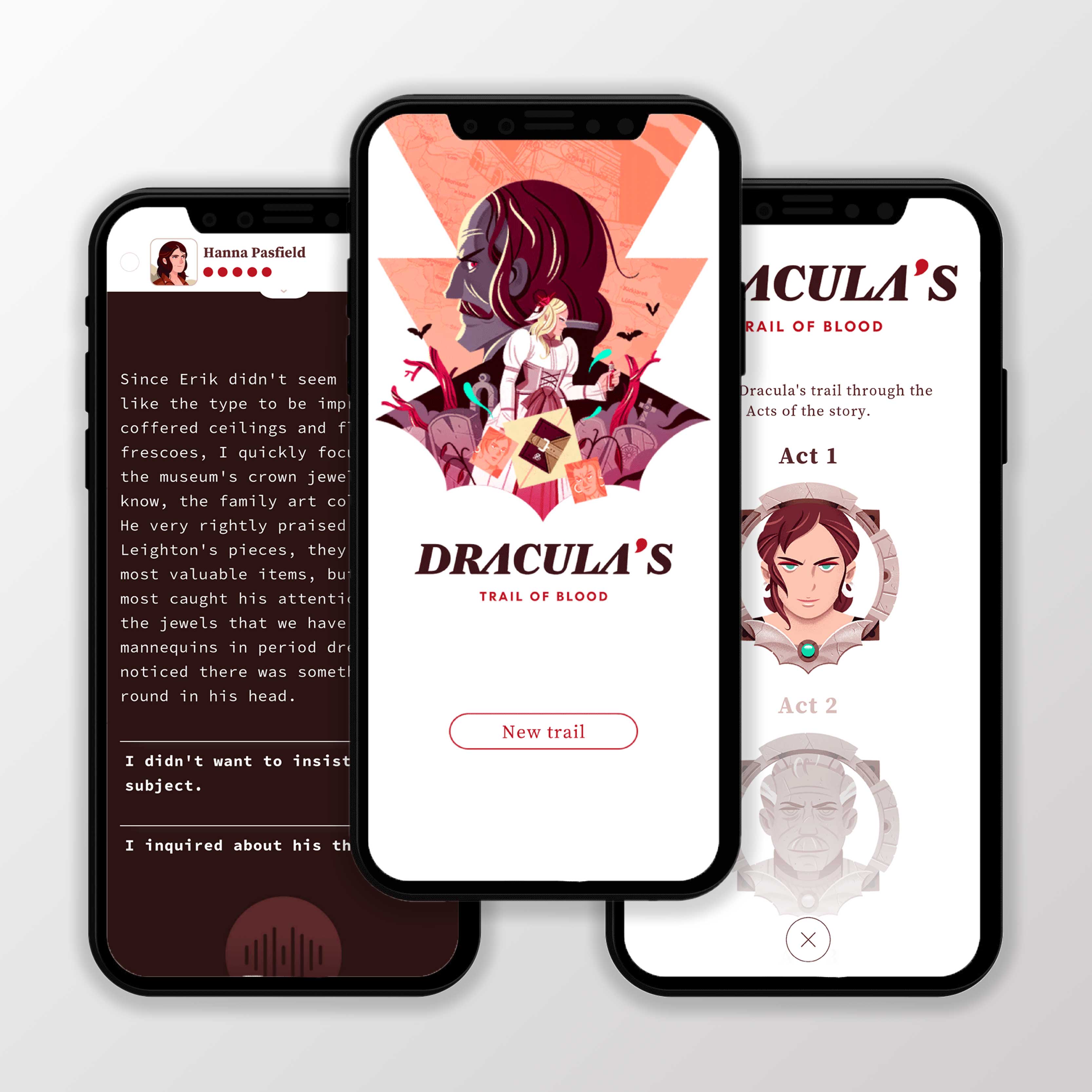 Drácula: Rastro de Sangre permite alternar entre tres protagonistas distintos: el psicólogo Erik Seward, la historiadora Hanna Pasfield y el sacerdote Fremont Van Helsing. La necesidad de gestionar las diferentes voces y recursos de los protagonistas supuso redoblar esfuerzos de codificación y diseño.