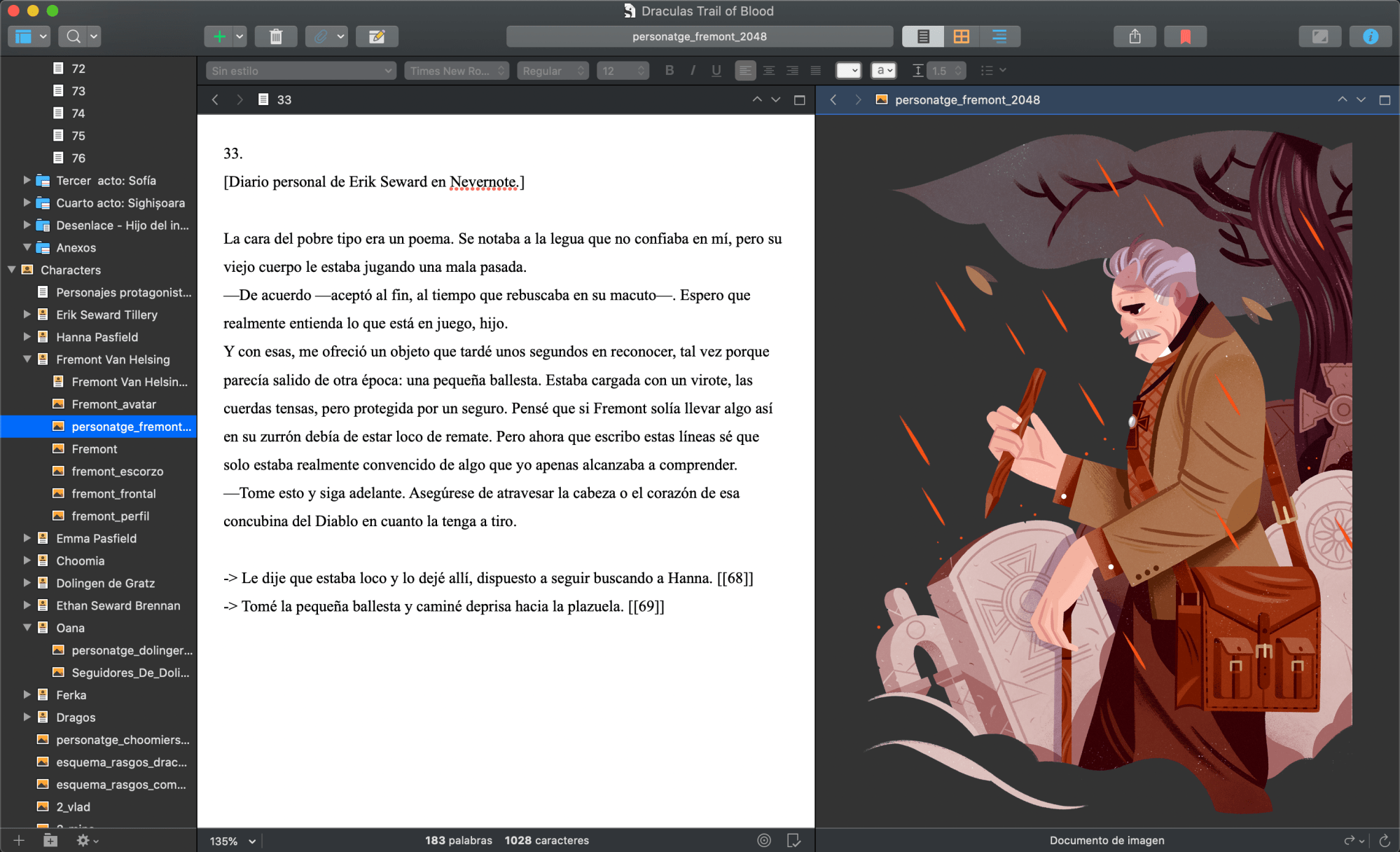 Una vez establecidos los bloques en los esquemas, redactaba cada sección en Scrivener como un archivo independiente y numerado. Me resultaría imposible afrontar un proyecto como este sin una herramienta de redacción como Scrivener, que permite clasificar las diferentes piezas del relato y visualizar varias de ellas al mismo tiempo.